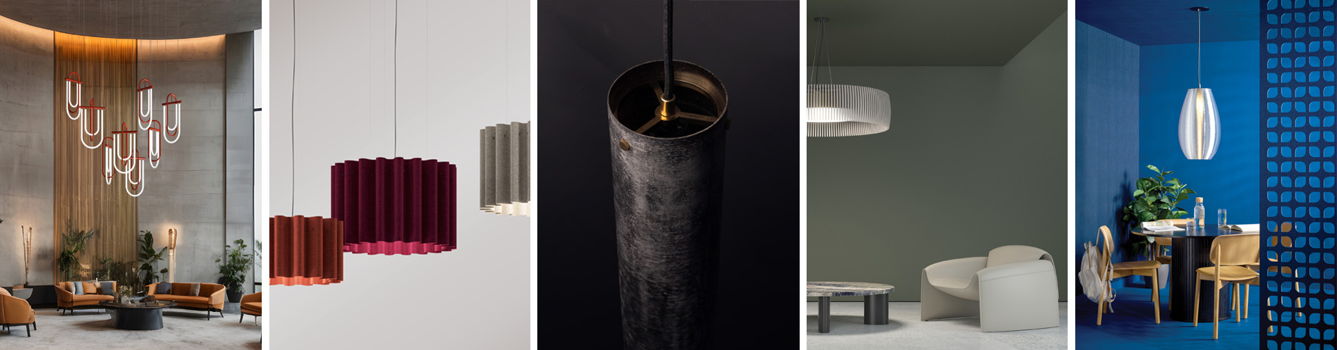 Finalists in Pendant Lighting (from left): Legato Lighting Design by Yellow Goat Design; Kurtain by Luxxbox; The Dead City Pendant by Mutuus Studio; Lia by Focal Point; Clear Coil Collection by LightArt.