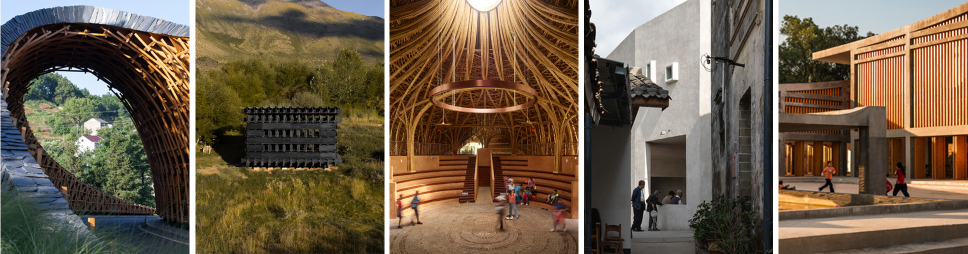 Finalists in Architecture +Localism (from left): Woven Passage to Cloudy Peaks by line+ studio; Shannan Beehive Observation Cabin by OMNO Lab; Maona Village Center by SUP Atelier of THAD; FW JI· The Rural Memory Museum by IARA; Duling Educational and Cultural Centre by Project Mingde