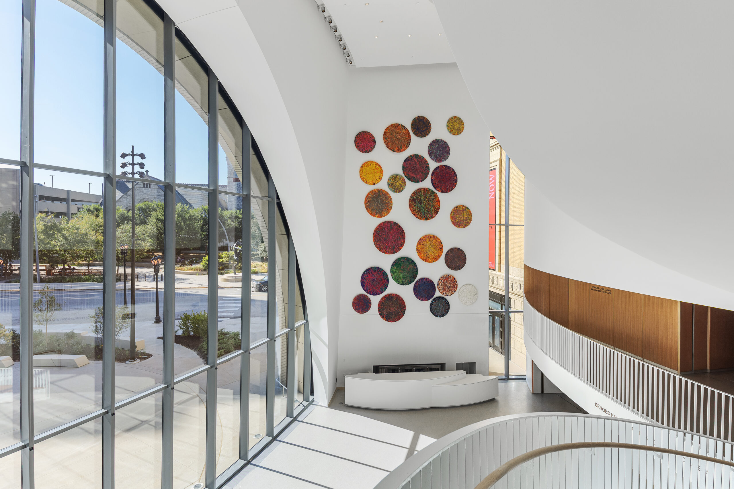 Huge arched windows connect the public plaza outside with the entrance lobby inside; photo by Sam Fentress.