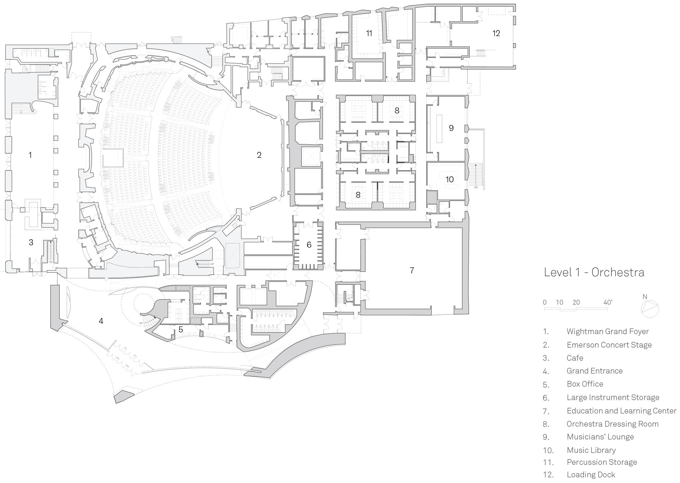 Ground floor plan of Powell Hall with new lobby to the south and expanded back-of-house spaces shown to the east; drawing courtesy of Snøhetta