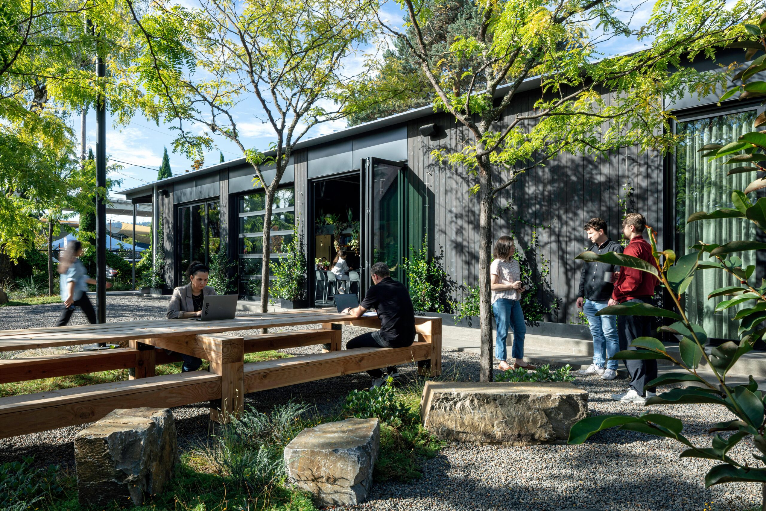 Communal dining area and kitchen opening onto lush gardens and extensive open-air spaces, including cooking area with fire pit, meeting zones and social corners at Skylab HQ by Skylab, Portland, Oregon | Jury Winner, Commercial Adaptive Reuse, 13th Architizer A+Awards