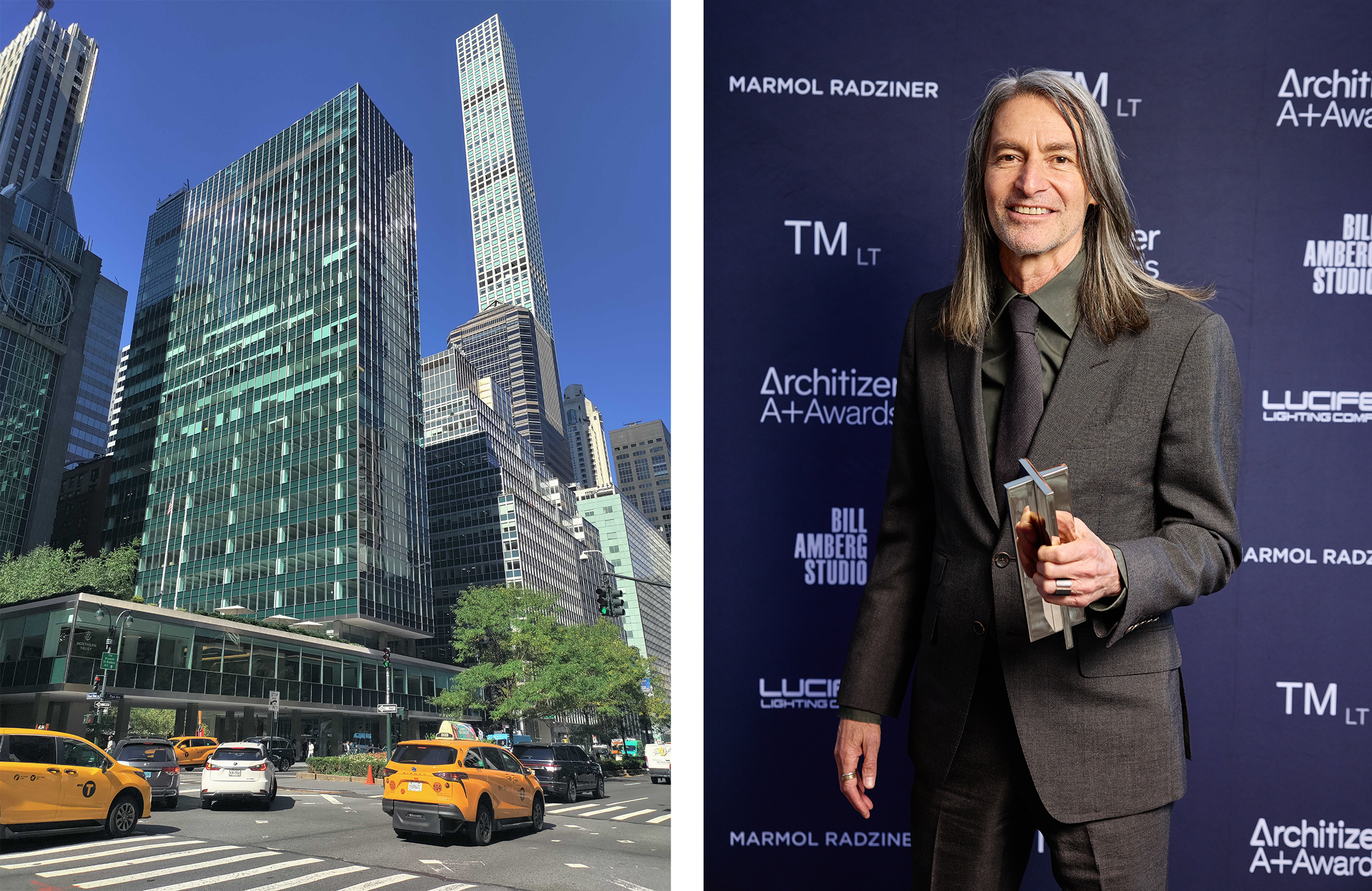 Left: SOM’s iconic Lever House played host to the A+Awards’ NYC celebration; photo by Paul Keskeys. Right: Ron Radziner, CEO and Founder of Marmol Radziner, picked up a Project of the Year Award for the Lever Club; photo by Zack DeZon.