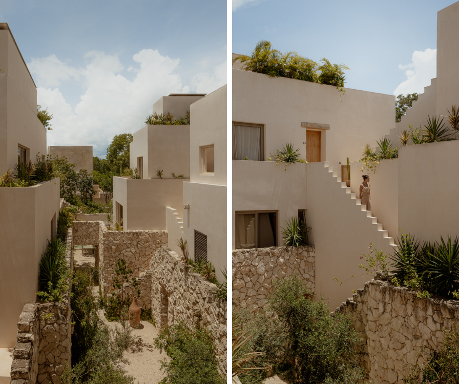 Hacienda Wabi rises quietly within the jungle, shaped by light, vegetation and the slow passage of time. Terraces and stairways unfold through layers of stone and chukum plaster, creating a structure that feels discovered rather than designed. Each surface absorbs the marks of its environment as plants take root and shadows shift across the walls. Courtyards and open corridors divide the plan into small, shaded spaces that connect the apartments with air and light. The architecture appears to grow from the earth while allowing nature to take it back. It is a calm composition of matter and decay, where age becomes a measure of beauty.