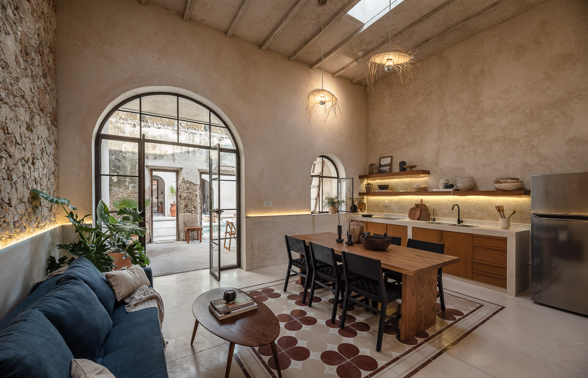 This project restores a 17th-century manor house in Puebla’s historic center, turning centuries of decay into a framework for new life. The intervention began by stripping away later additions, exposing the original bays, arches and courtyards. What remained guided the design of seven apartments organized through vertical movement, using double and triple-height spaces to draw light through thick stone walls. Skylights and voids create visual connections between levels while preserving the integrity of the historic shell. Layers of paint were removed to reveal the natural patina of time, allowing traces of wear to remain visible. Steel panels and patterned tiles introduce a contemporary counterpoint, grounding the renovation in both memory and use.