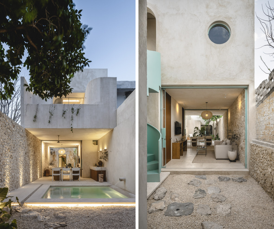Vistalcielo revives an abandoned house in Mérida’s historic center, turning decay into a framework for renewal. The design preserves the original layout of patios and passageways, creating a sequence of open and covered spaces where light and air move freely. Soft curves replace rigid walls, allowing the structure to feel shaped by its surroundings. Layers of grey cement, regional stone and striated concrete record the textures of time, while sky-blue window grilles recall the house’s past. Each module opens to a garden, pool or terrace, forming a continuous dialogue between interior and exterior. The result is an architecture that honors what was left behind while celebrating life’s quiet return to the ruins.