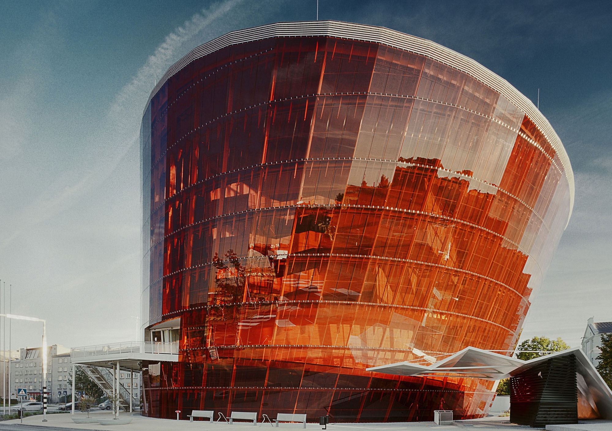 A concert hall more than a century in the making, Great Amber finally opened in Liepāja in 2015. The monolithic, cone-shaped volume leans slightly, conceived as a response to the city known as the birthplace of wind. Its translucent amber façade wraps an irregular concrete structure, forming a protective envelope around the performance spaces within.