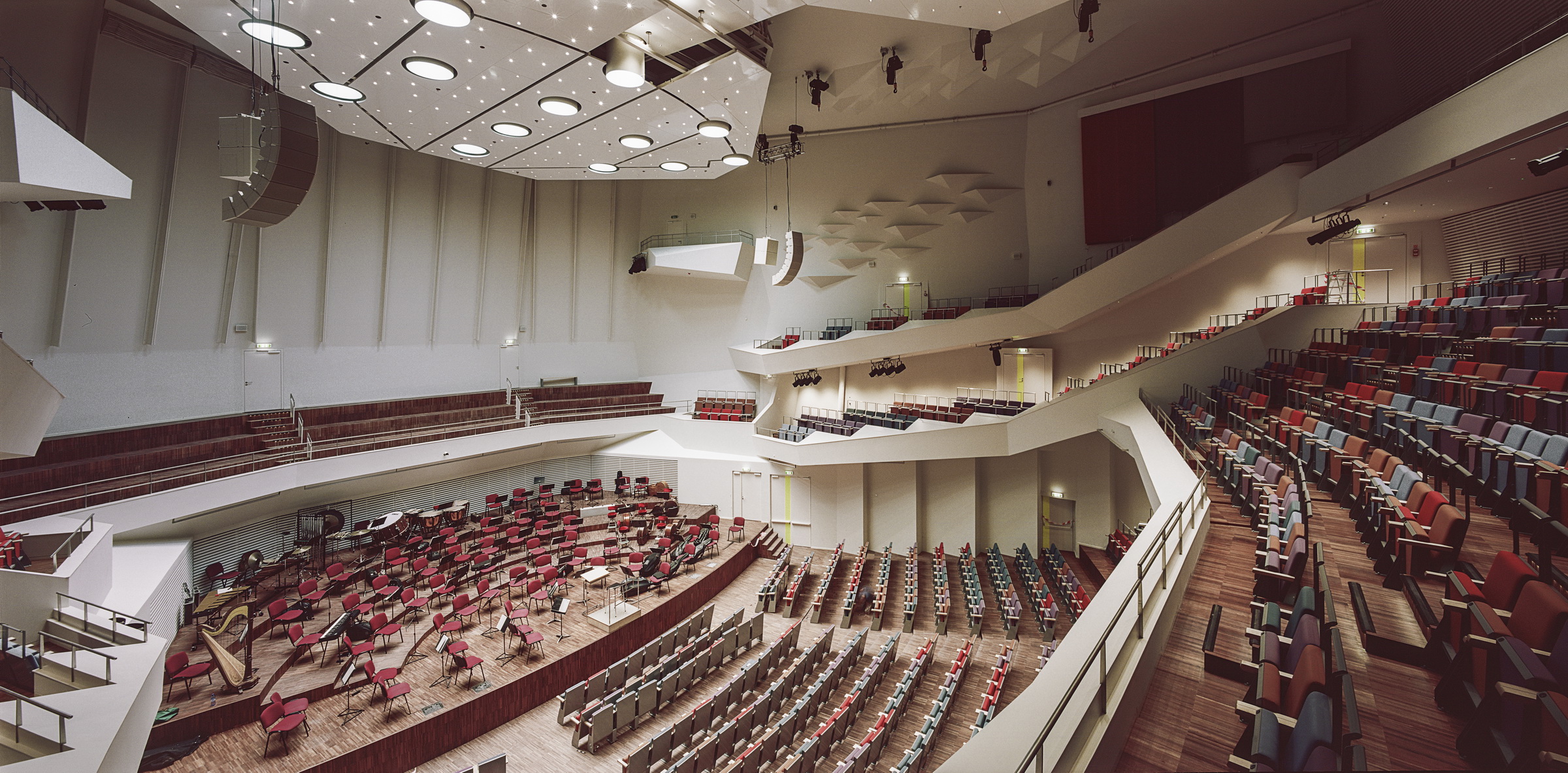 Inside, the main hall follows an oval vineyard layout to achieve precise acoustics, developed with Müller BBM. Helmholtz resonators and an adjustable reflector fine-tune the sound. Fourteen reflective tubes draw daylight deep into the interior. The building houses multiple stages and music education spaces, establishing a new cultural anchor for the city.