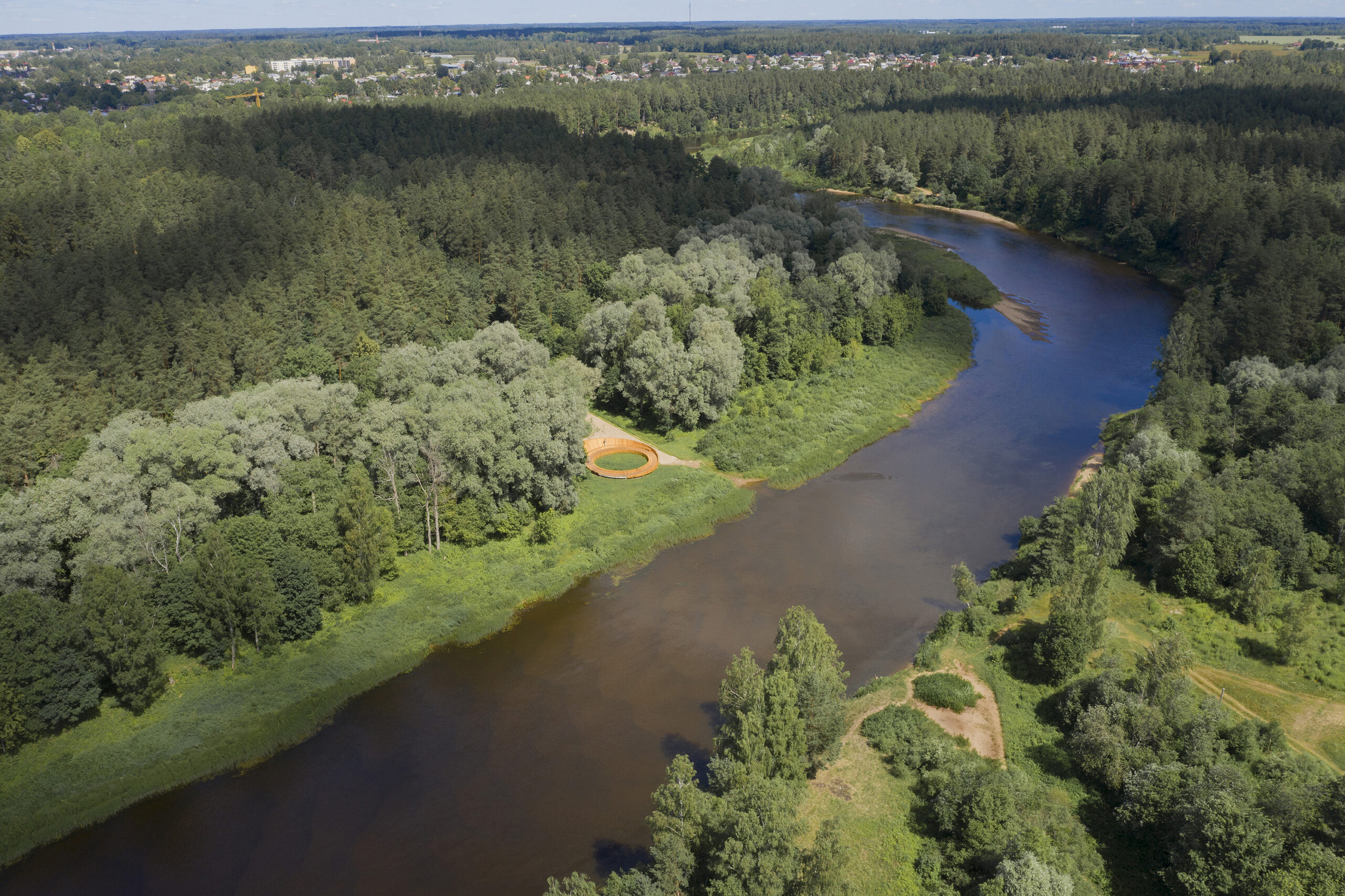 In Valmiera, this pedestrian path and viewing terrace turn a simple walk into a gradual approach toward the Gauja. A gravel track branches from the asphalt road and shifts into a timber walkway. It ends in a circular platform that meets the water with restraint.