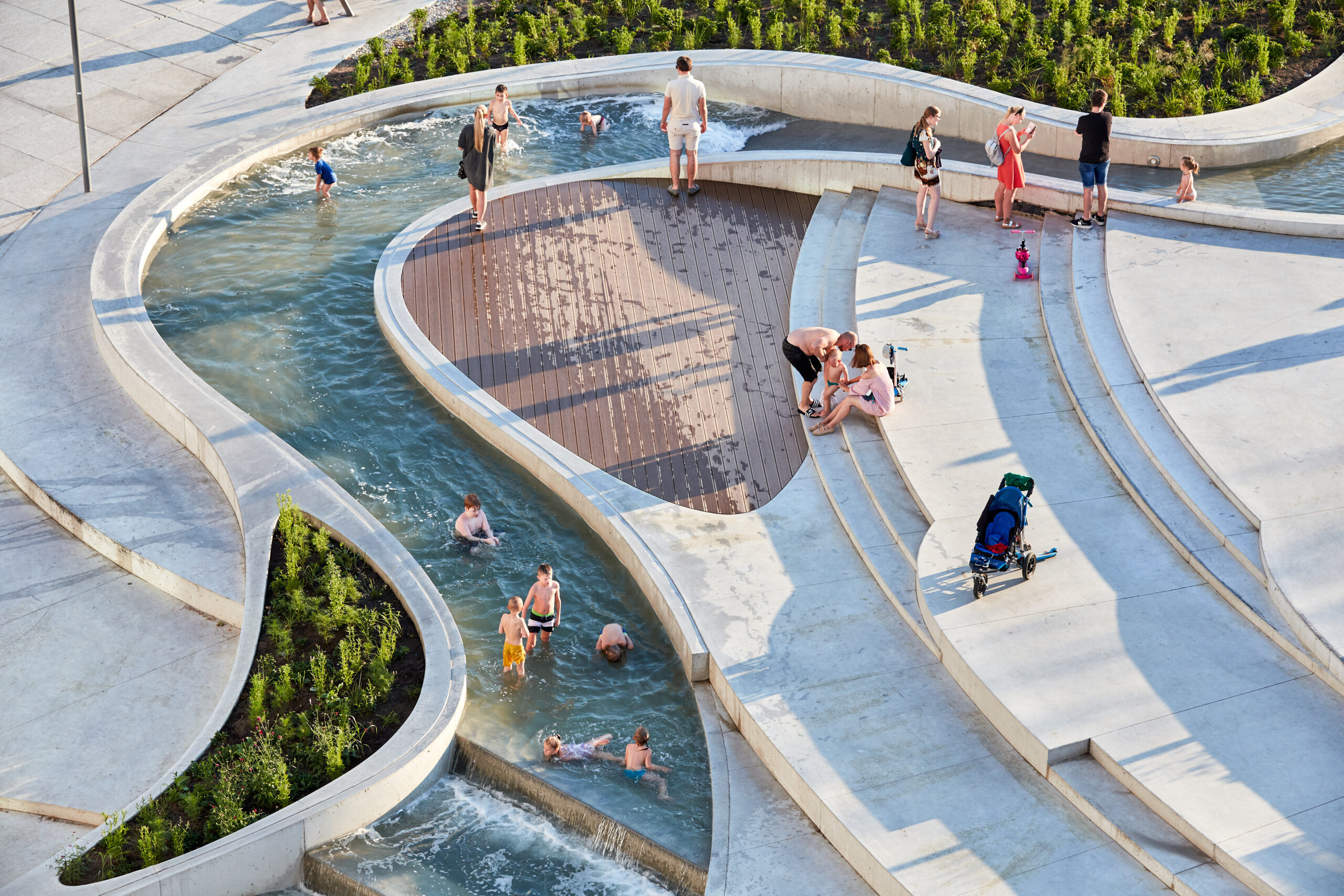Light granite, timber and sculpted white concrete define the terrain. Sloped lawns, stepped seating and skateable forms create an active surface. Water features cool the open plane and invite play. An underground garage keeps cars out of view. Surrounding buildings were renovated and extended, unified by white façades and open interiors. The result supports everyday use, public events and new patterns of urban mobility.