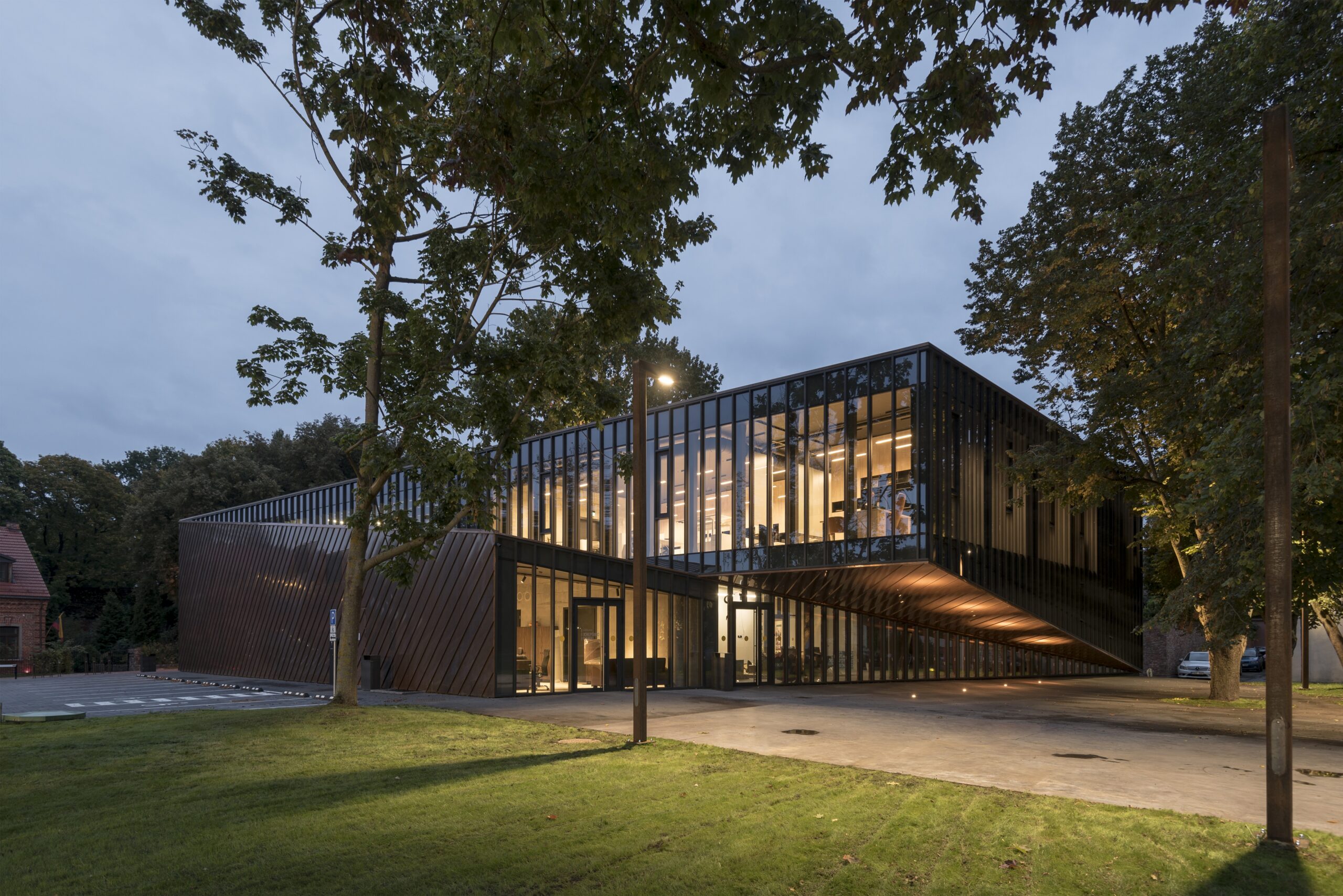 A museum dedicated to Lithuania’s most celebrated sport, the House of Basketball, stands at the meeting point of Kaunas Old Town and Santaka Park. The building marks the edge of the historic quarter while presenting a clear contemporary form. Its curved volume wraps around a century-old oak tree, which becomes the spatial anchor of the project. A small courtyard forms at this center, guiding visitors toward the entrance.