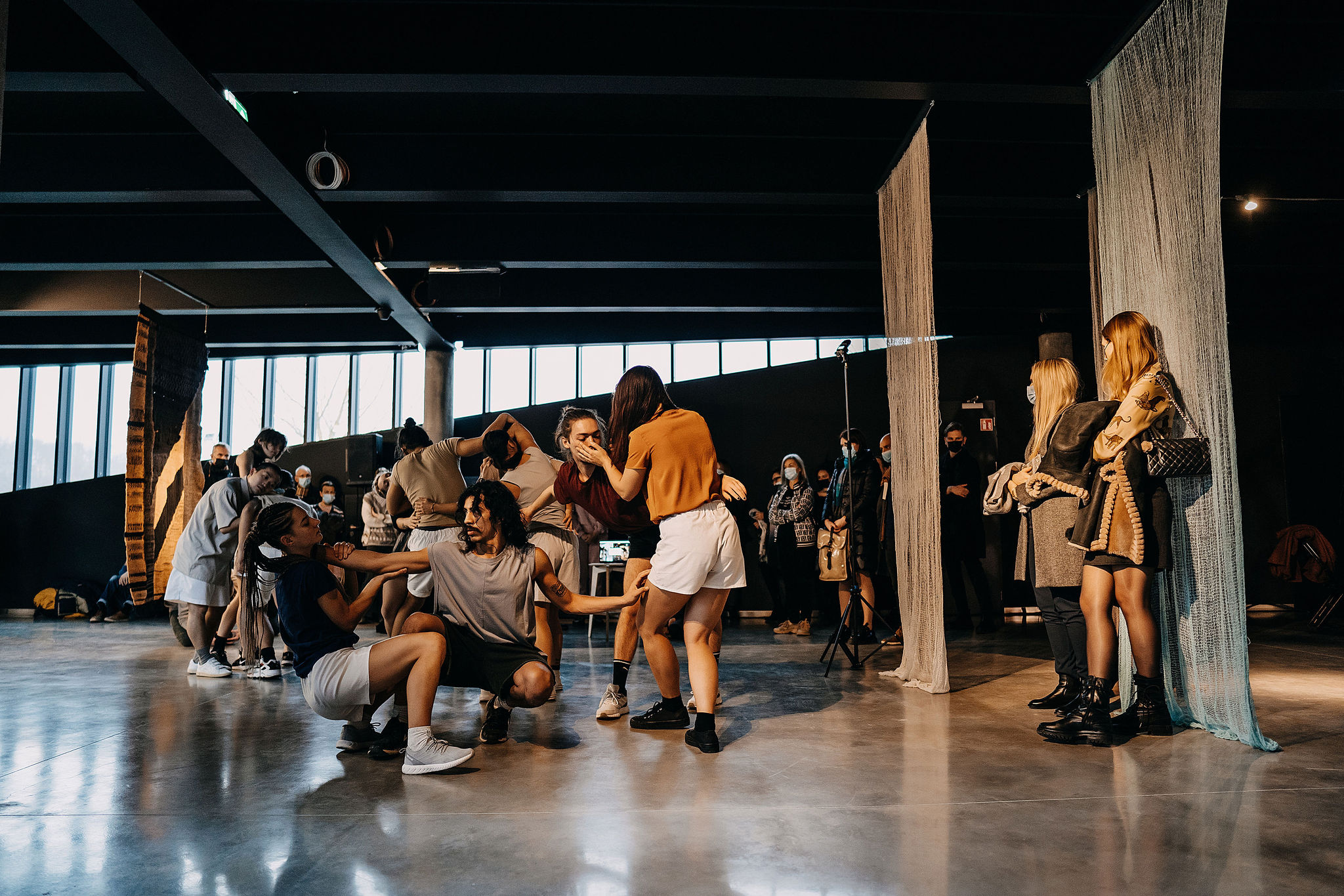 The volumes echo forms found in the landscape. The structure limits ground contact to protect the meadow. Nearby workshops use modular units that can be rearranged and carefully positioned. Vertical fabric bars wrap both pavilion and modules, rotating to adjust transparency and light. The project turns performance into a dialogue with nature.