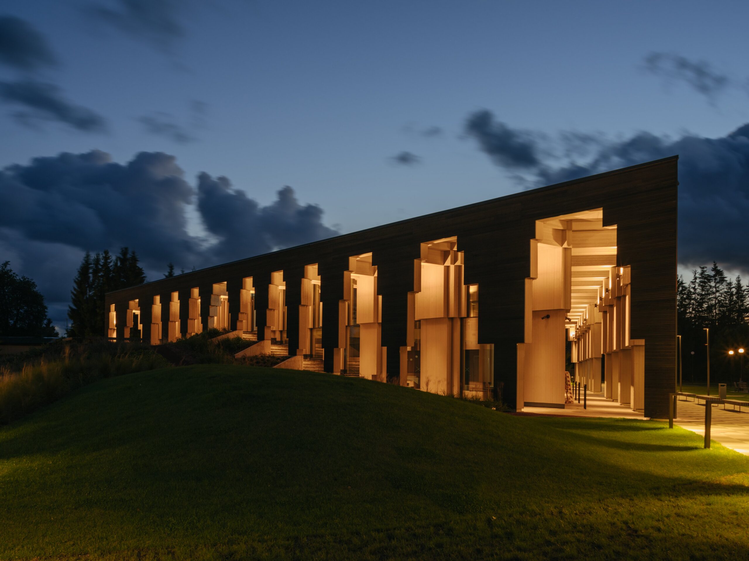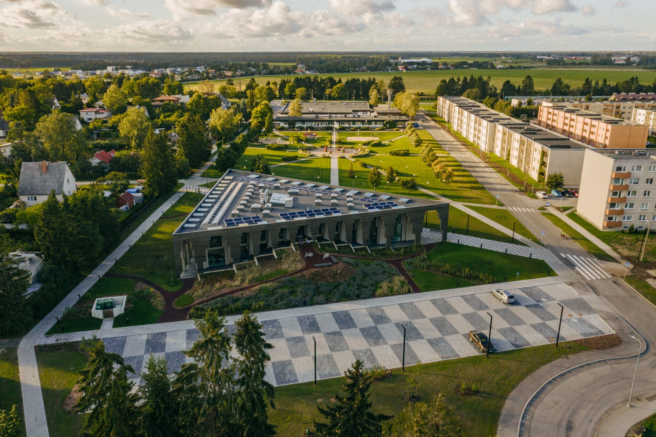 Set at the edge of Saue’s central park, the rural municipal building closes the green space with quiet authority. From a distance, it reads as a pavilion. A carved archway cuts through the triangular volume, marking the entrance while offering shelter to passersby. A double-skin façade protects the workspaces within, balancing openness and privacy.