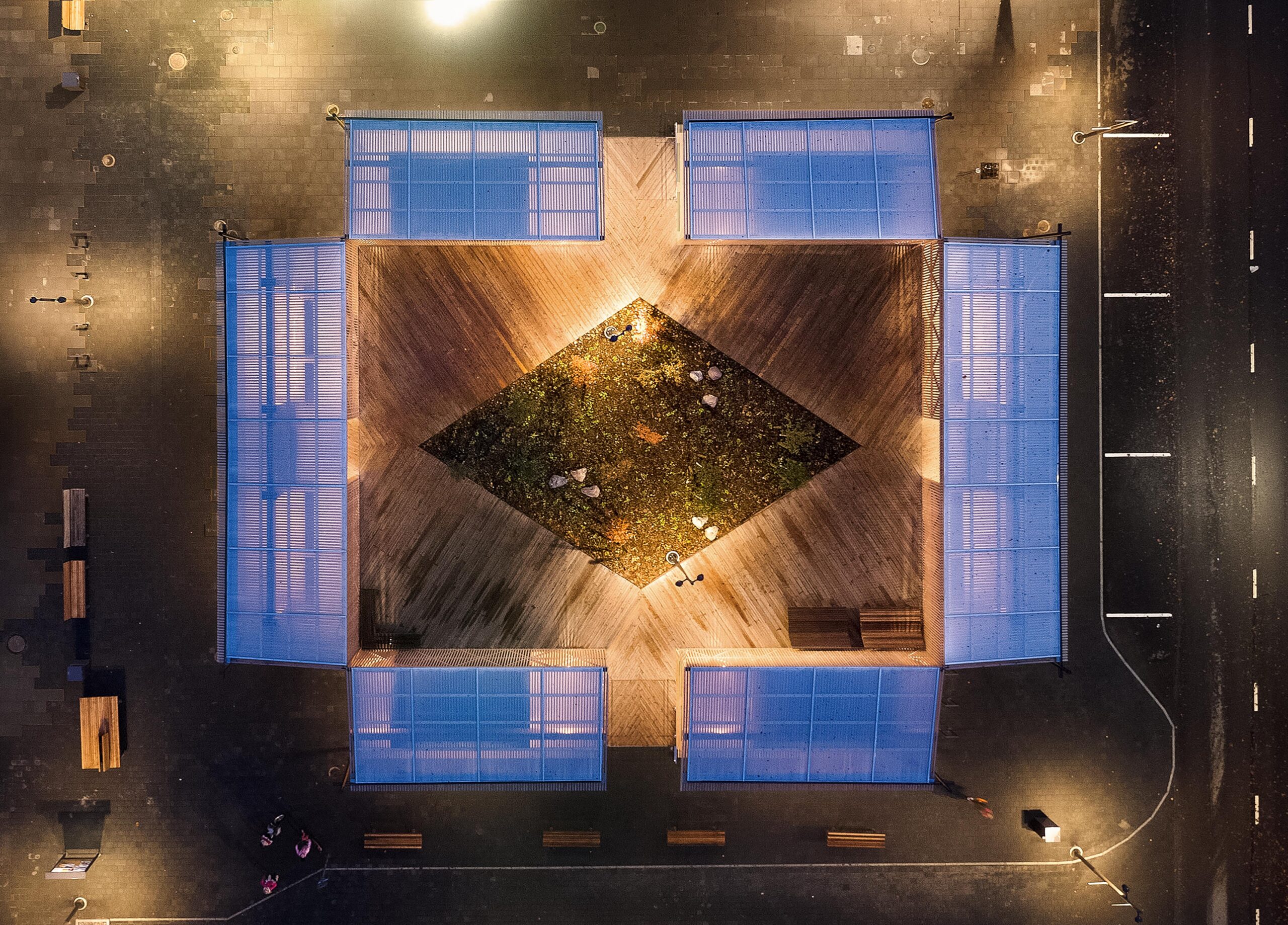 The interior is calm and largely open, while activity lines the edges. Market stalls, a small stage and an info center face outward toward the square. Slender wooden slats filter light, with spacers referencing patterns from Kärdla’s textile past. A glass roof admits sky and weather. Over time, the timber will weather, and the garden will grow denser, giving the square a steady civic presence.