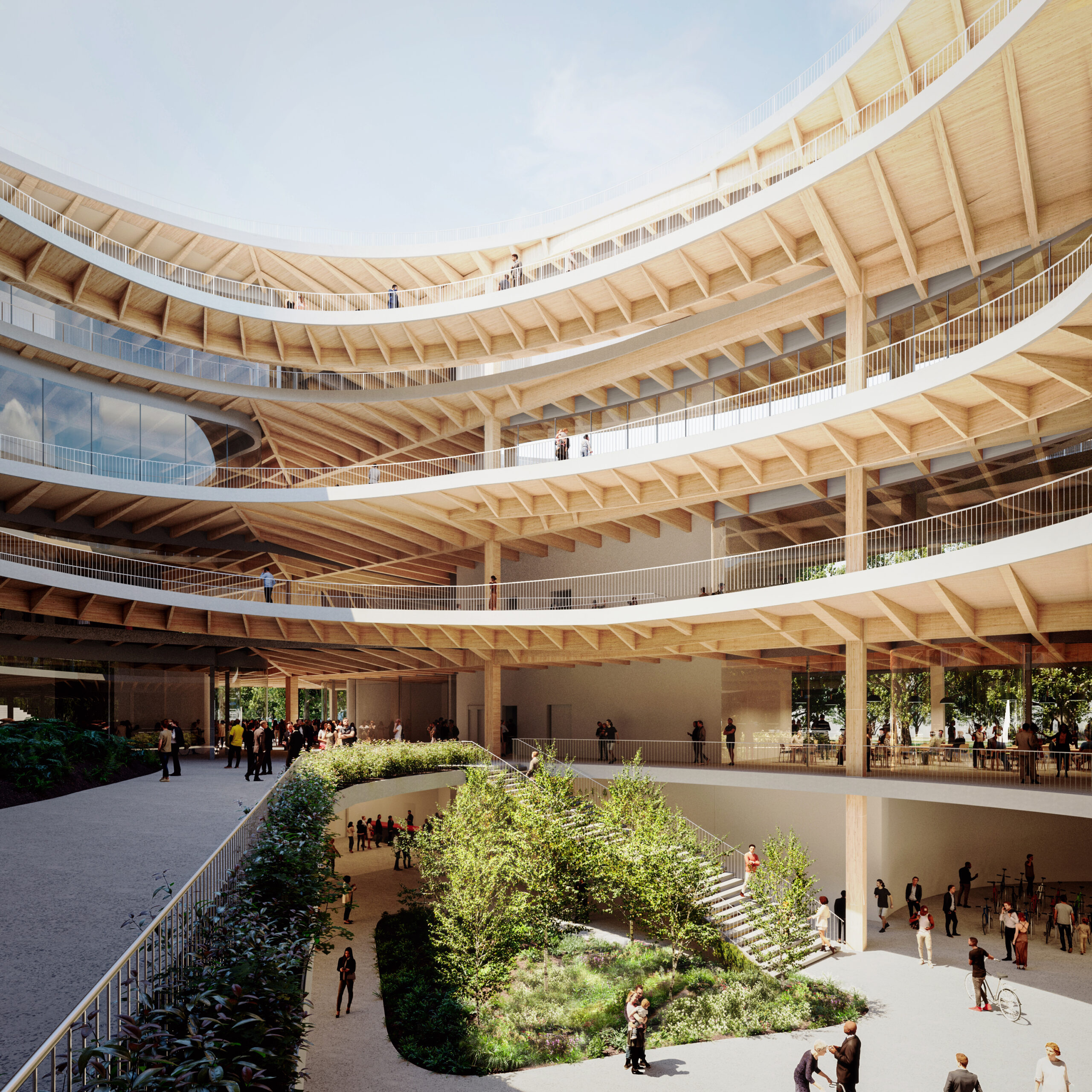 Each level is conceived as a spatial interpretation of one of Estonia’s five national park landscapes. Undulating floor plates circle an open courtyard and connect through a continuous ramp, guiding visitors upward through museum spaces, a library, a cinema, and restaurants. A rooftop park would frame views over the city, completing a gradual ascent from river to skyline.