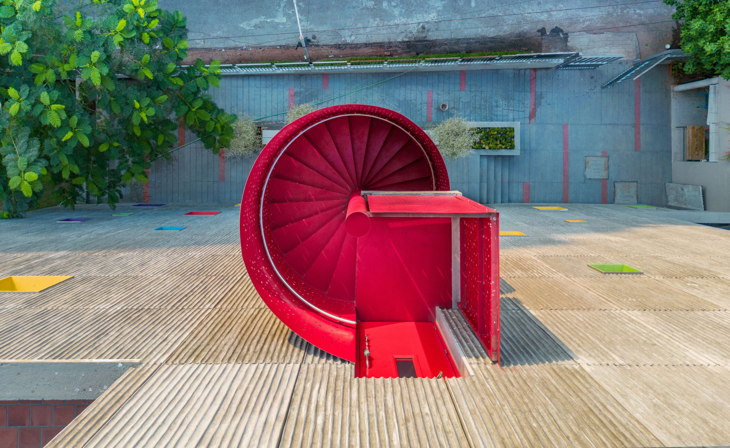 Built for children in homeschooling and unschooling programs, the Learning Center at Quest is designed as a place for curiosity-led education. A tall atrium connects stacked classrooms, library spaces, and a rooftop cafeteria, with movement guided by a striking spiral stair that bursts from the façade in bright red. Inside, the same bold color reappears in staircases and doors, adding rhythm and energy to the raw concrete shell. The red accents stand out among other playful details, like colored window frames and murals, and help give the building its identity. In a setting shaped by air, light, and openness, these flashes of red reinforce the school’s focus on interaction, exploration, and joy in learning.