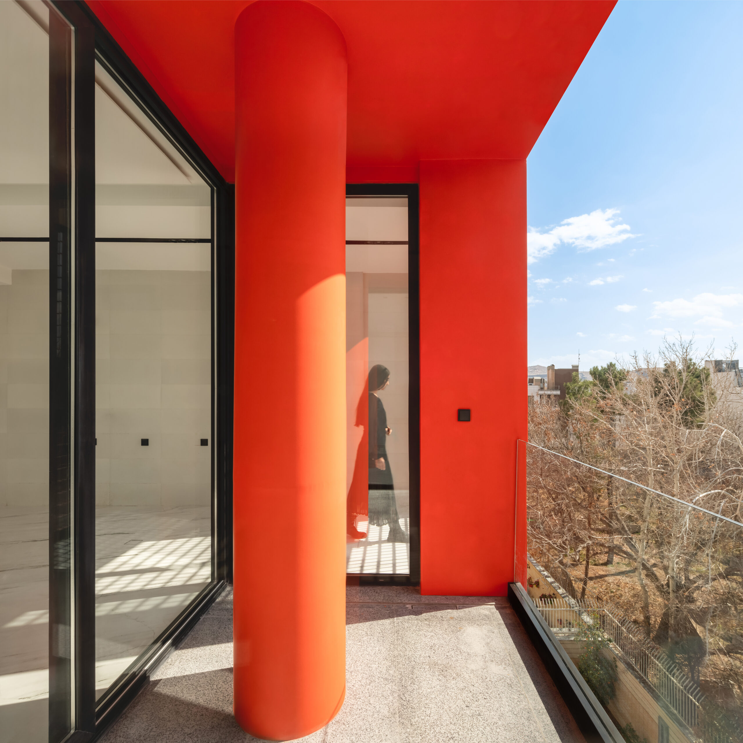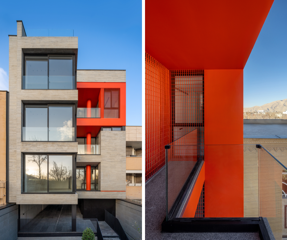 Set at the end of a narrow alley in Shiraz, the Nozhan Residential Apartment challenges the limitations of a back plot through bold material choices. The building’s façade is constructed from recycled stone offcuts, turning industrial waste into a defining architectural surface. Alongside this heavy material presence, strong red accents break up the mass, shifting parts of the structure toward abstraction. This dual strategy creates both weight and lightness, making the project stand apart from its surroundings. For residents, the design provides a sense of character and identity in a typically overlooked site, proving how color and material together can transform modest conditions into a distinctive urban landmark.