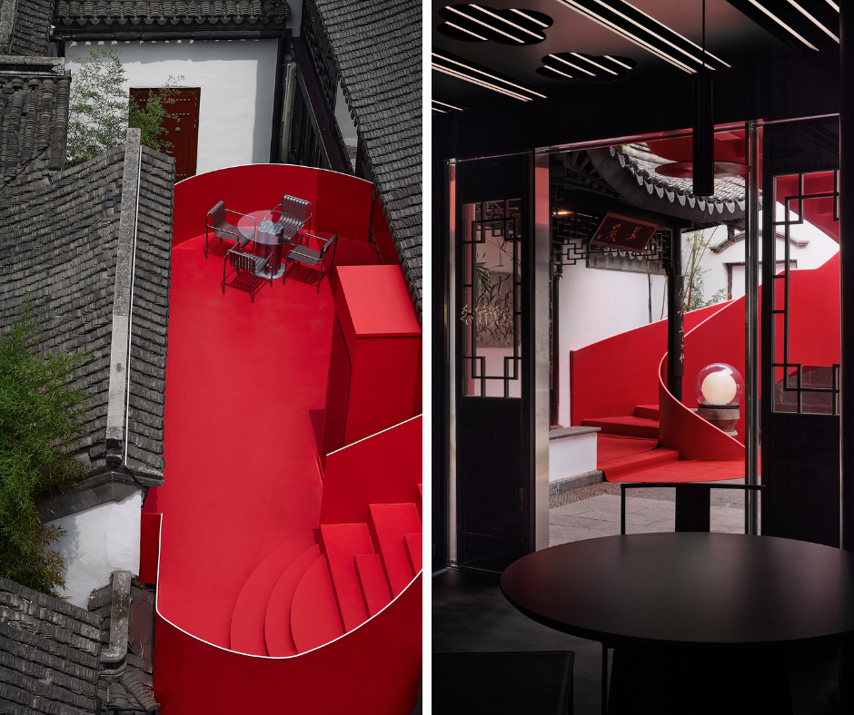 Located along Nanjing’s Qinhuai River, this renovation adapts a historic site into a crayfish-themed dining and commercial destination. The project preserves the character of the old structures while introducing bold steel staircases that connect multiple floors. Finished in Chinese red, the staircases stand out against the muted tones of the surrounding architecture and tie directly to the theme of the “Big Red Crayfish.” Their flowing forms cut across the complex, linking once-isolated spaces and guiding visitors through the site. Beyond circulation, the staircases create new perspectives of the river and nearby temple, while their striking color has turned them into a popular landmark, helping to draw people in and support the site’s cultural and commercial renewal.
