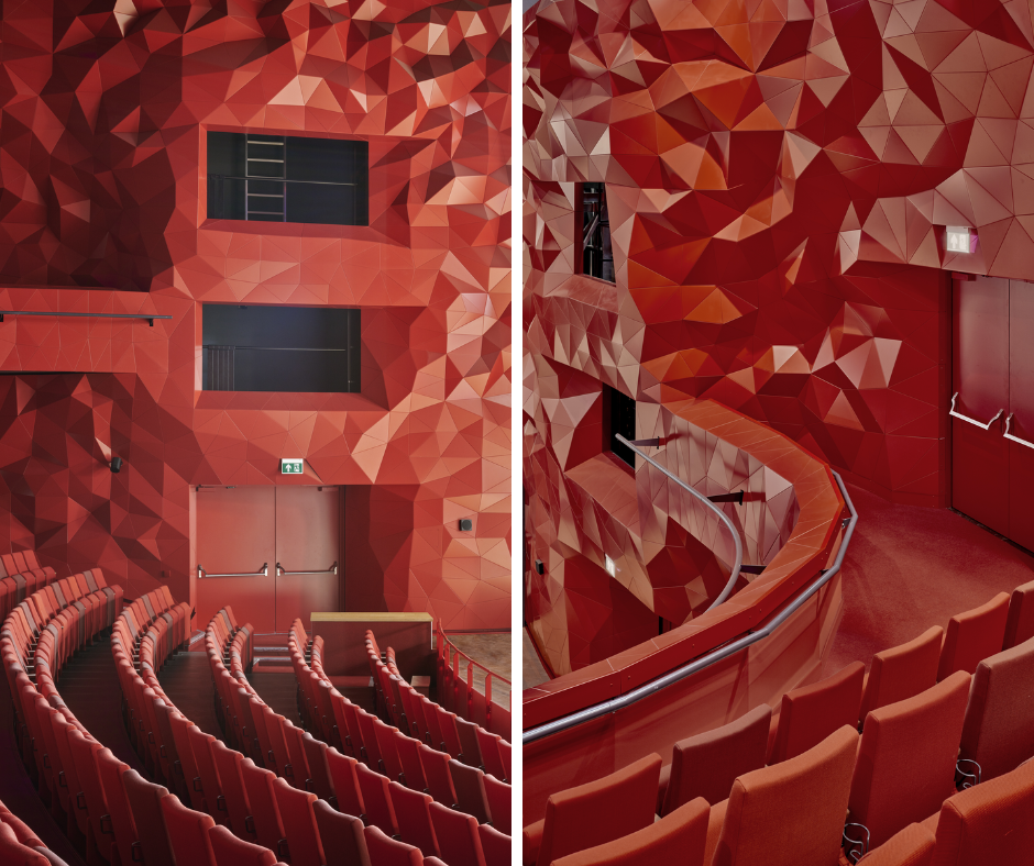 In Rotterdam, Studio RAP designed the striking interior of the Zuidplein Theater’s main hall. Commissioned by the City of Rotterdam under a strict budget and timeline, the project uses digital algorithms to generate a rippling surface of 6,000 unique aluminum-composite panels. The result is a fluid wall system that shapes the acoustics of the auditorium while surrounding audiences in a continuous wave-like form. Bright shades of red were chosen to heighten the drama of the space, making the hall both visually and acoustically unforgettable. The bold color reinforces the theater’s role as a place of performance, ensuring the audience’s experience is as powerful to the eye as it is to the ear.