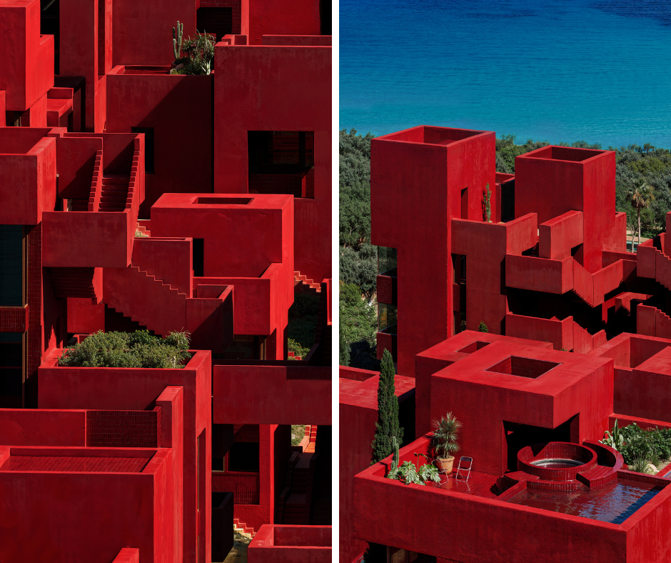 Set on the rocky slopes of the Albanian Riviera, Red Sol Resort organizes a steep, rugged site into a structured grid of villas. Each unit is arranged as a square, shifting in height to follow the terrain and open views of the sea. Private courtyards and rooftop pools give residents intimacy, while a network of stairs, bridges, and patios connects the villas into a shared community. Finished in striking red, the architecture recalls the Taller’s iconic La Muralla Roja and references the historic kasbahs of North Africa. The color anchors the complex in the landscape, giving the resort a strong identity while turning it into a landmark on the coastal horizon.