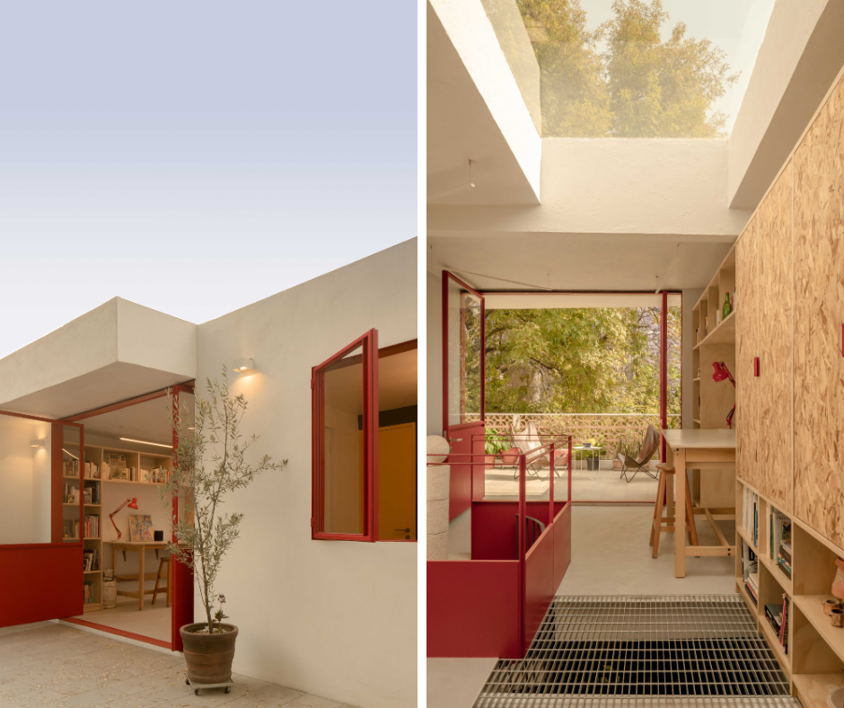 In Coyoacán, the renovation of artist Daniela Riquelme’s home expands the upper floor into a light-filled studio and workshop. The transformation introduces custom carpentry, a sawtooth roof, and generous openings to support painting, jewelry-making, and exhibition. A preexisting spiral stair anchors the layout, with a skylight above that draws light deep into the house. Across the interior and exterior, garnet red ironwork frames doors, windows, and railings. The color provides a strong counterpoint to pale walls and wood, while reflecting the artist’s own palette. These accents give rhythm to the space, highlight moments of transition, and tie the studio’s identity directly to Riquelme’s creative practice.