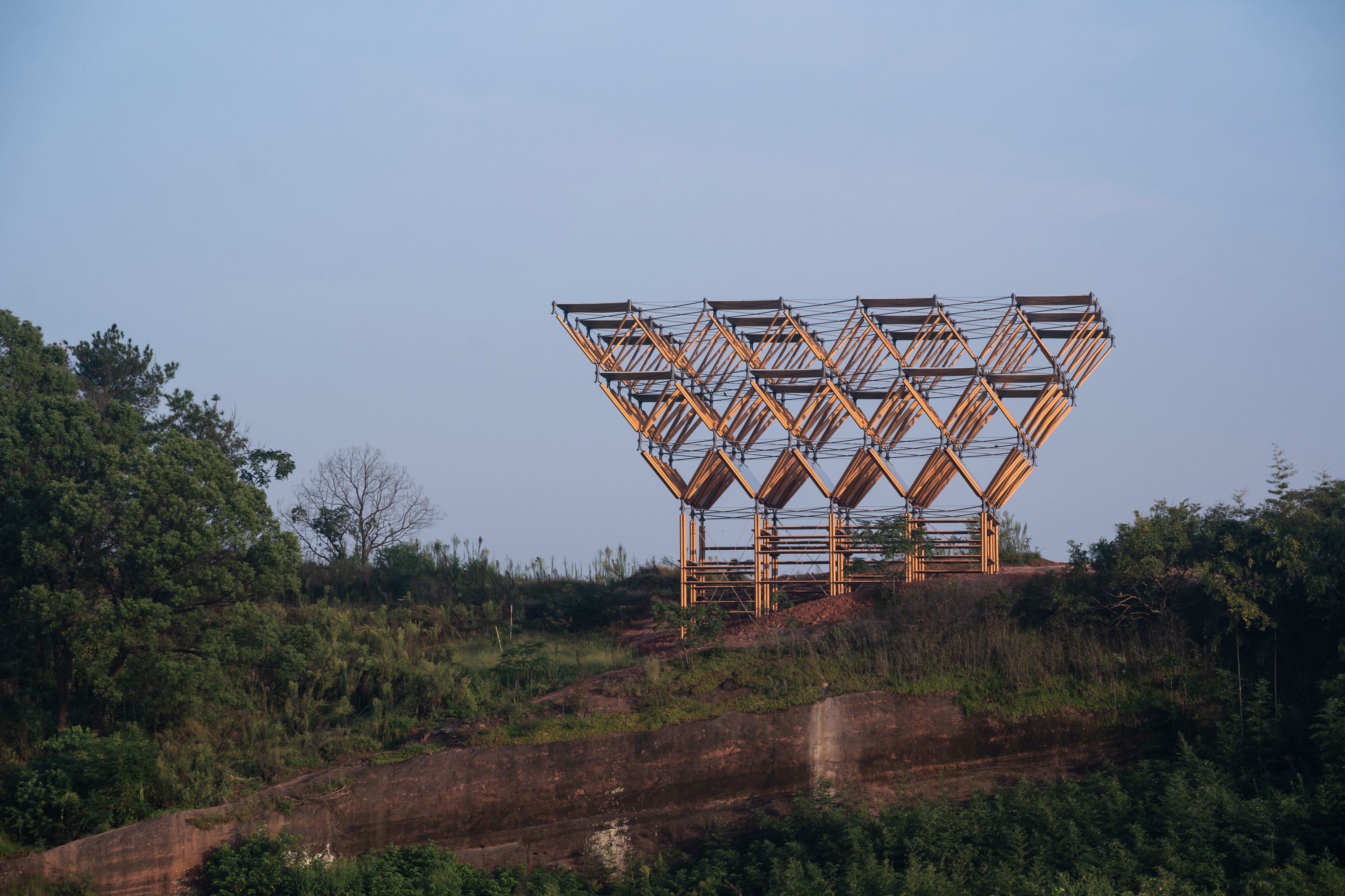 Located on a red sandstone highland in Longyou County, Sandstone Wood Pavilion by LUO studio explores “natural growth” through modular construction. The design draws inspiration from the geometric logic of plants, abstracting upward-reaching stems into a prefabricated steel-wood hybrid structure.