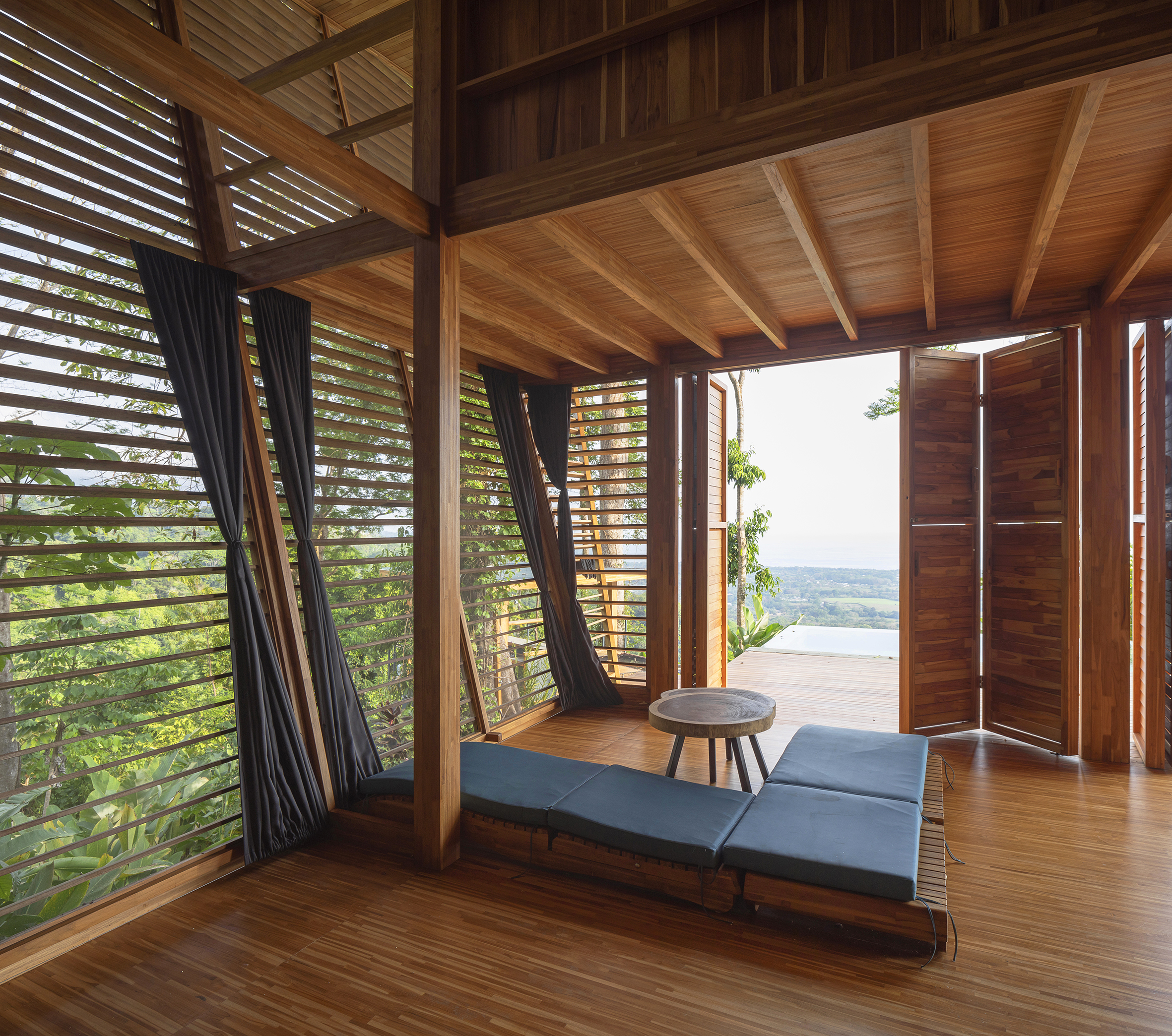 No Footprint Wood House in Costa Rica is a high-performance “breathing” lung within the tropical rainforest. Designed by A-01, the residence is defined by its semi-transparent skin, a dual-layer system of inclined timber slats and operable panels that replace traditional solid walls. According to its architects, this envelope is the key to its bioclimatic success, as the precise spacing of the regenerative wood slats facilitates 360-degree passive ventilation to regulate humidity and temperature.