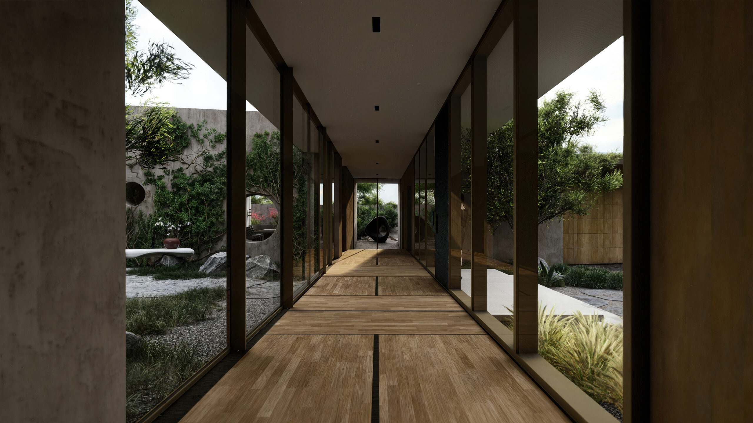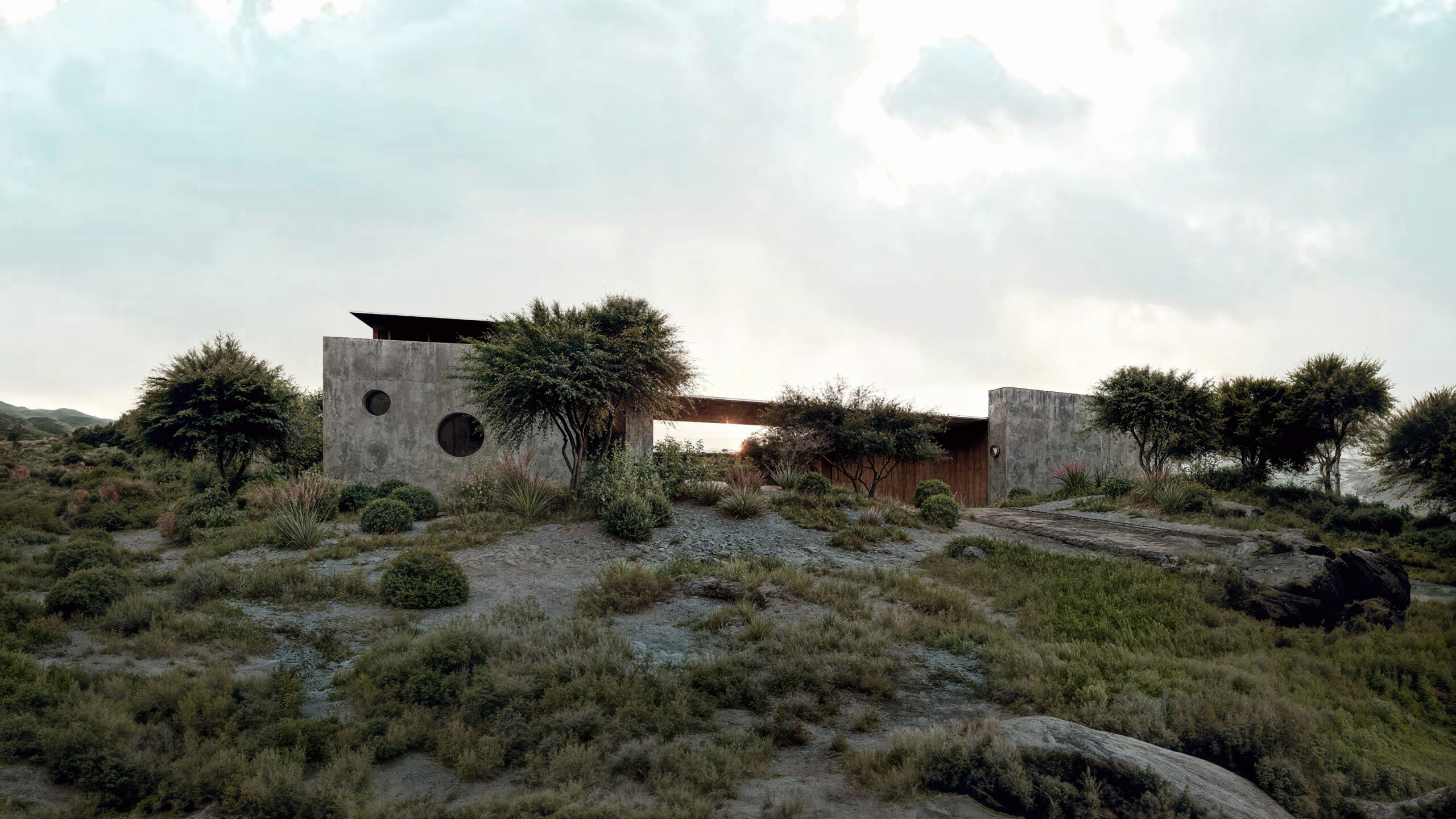 The design articulates this philosophy through its spatial and material strategies. Two non-parallel wings converge around the courtyard, which functions as both a circulation core and a passive cooling device. Overhangs provide solar shading, filtering light deep into interiors while reducing heat gain. The palette of concrete, metal and glass mirrors the tones of the surrounding rocks and sand, allowing the home to all but disappear into its environment.