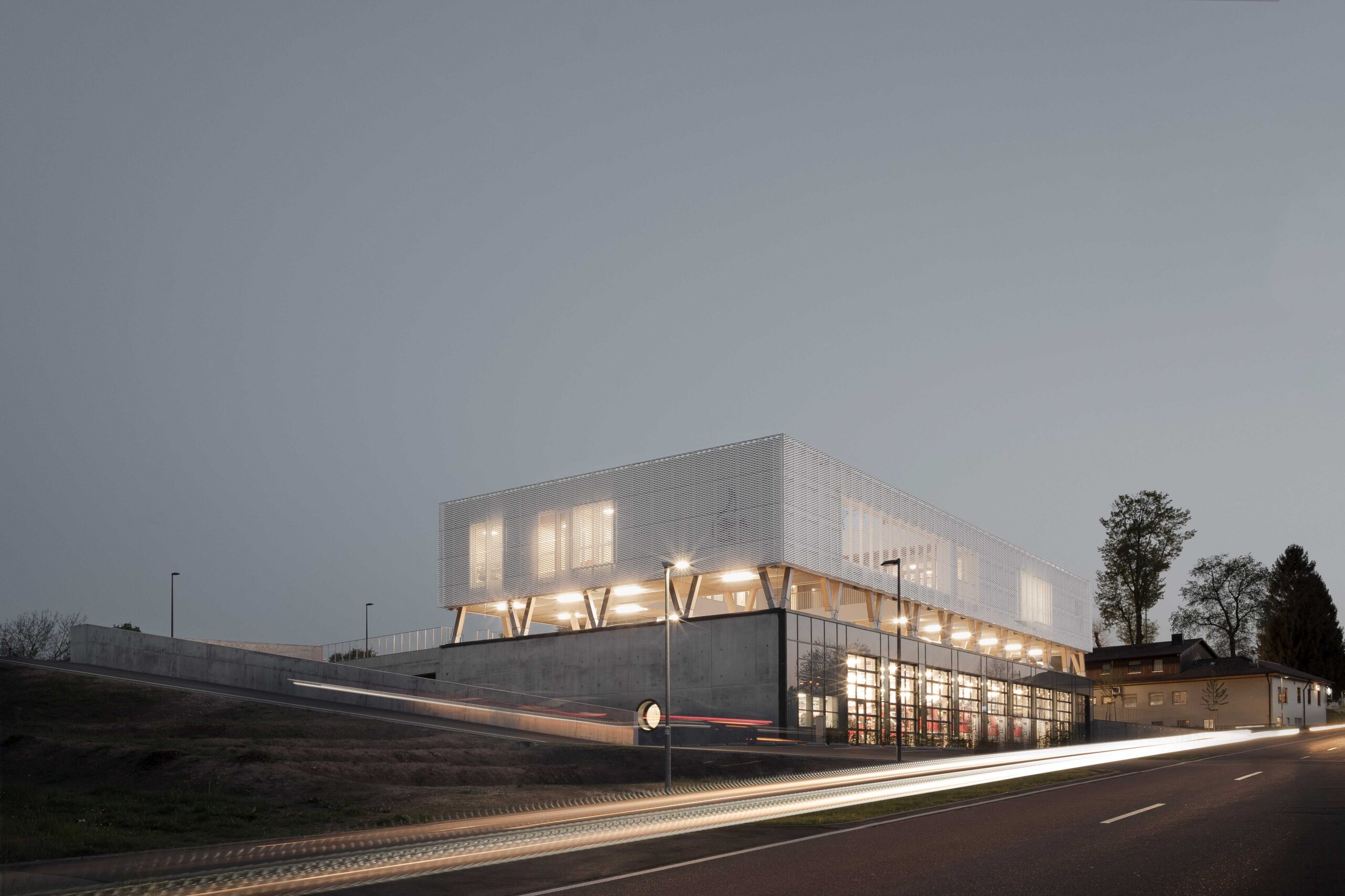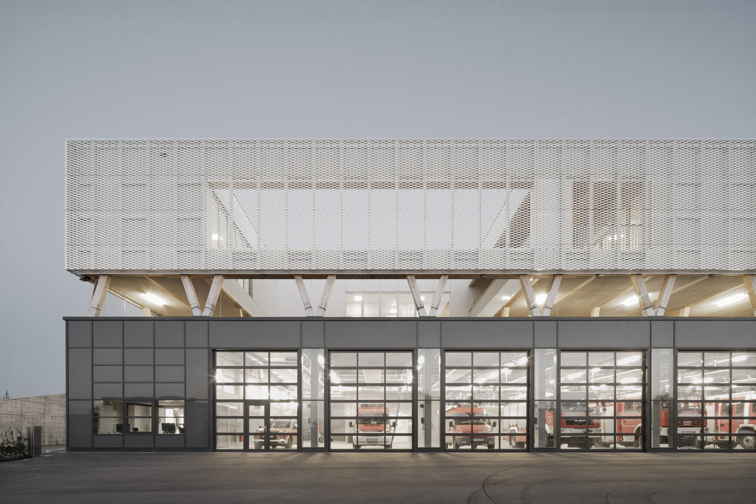 This fire station brings together six previously independent firefighting units on a single, strategically located site. It was conceived according to the »Cradle to Cradle« principle, an approach to circular construction in which materials are selected, detailed and assembled so they can be disassembled and reused at the end of the building’s life.