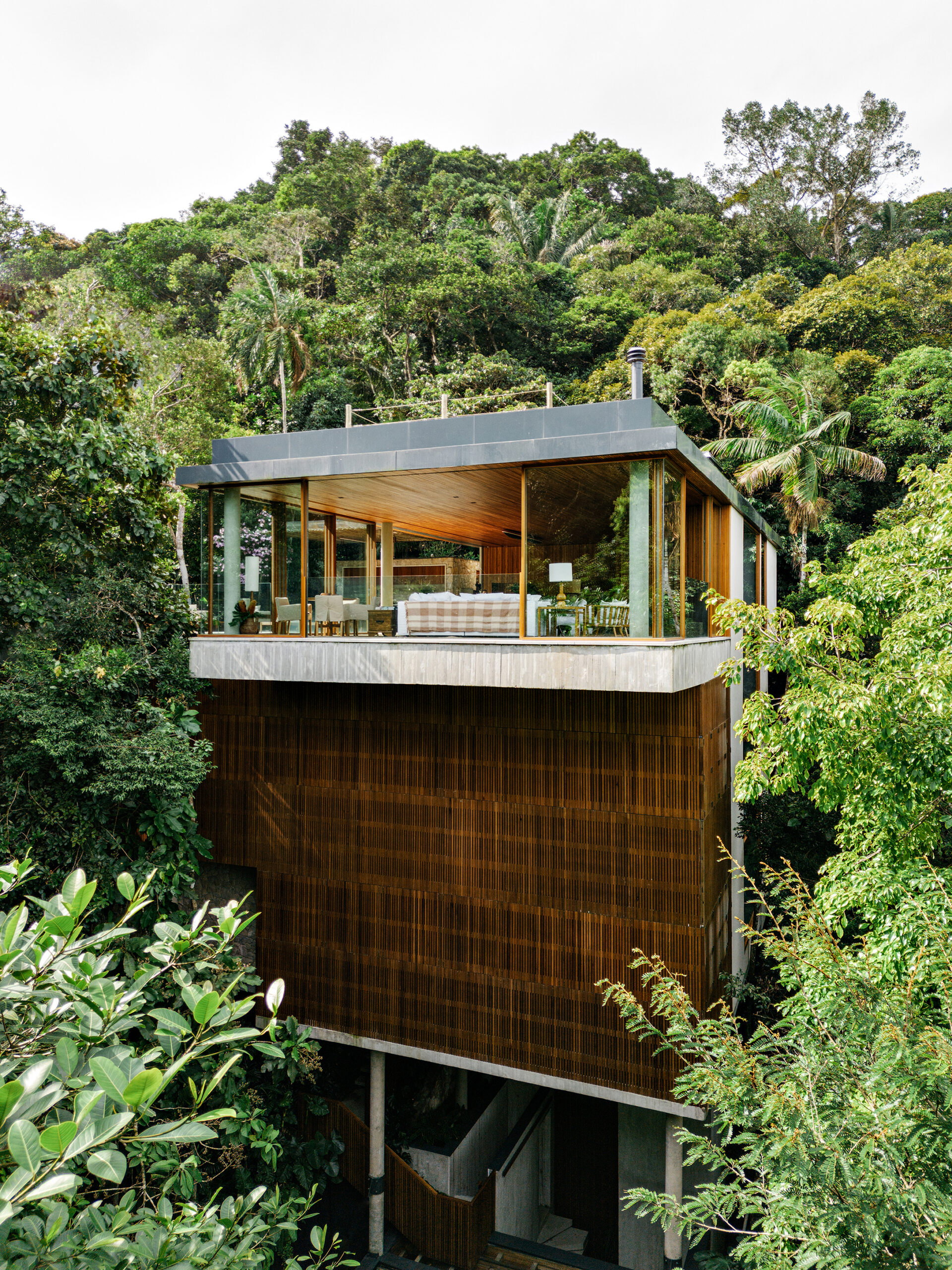 Set on a steep, forested site in Guarujá, VJC House is organized as a vertical sequence of platforms stepping down the terrain. The lower levels are partially embedded in the slope and contain the private rooms, while the upper floor opens toward the canopy and distant sea.
