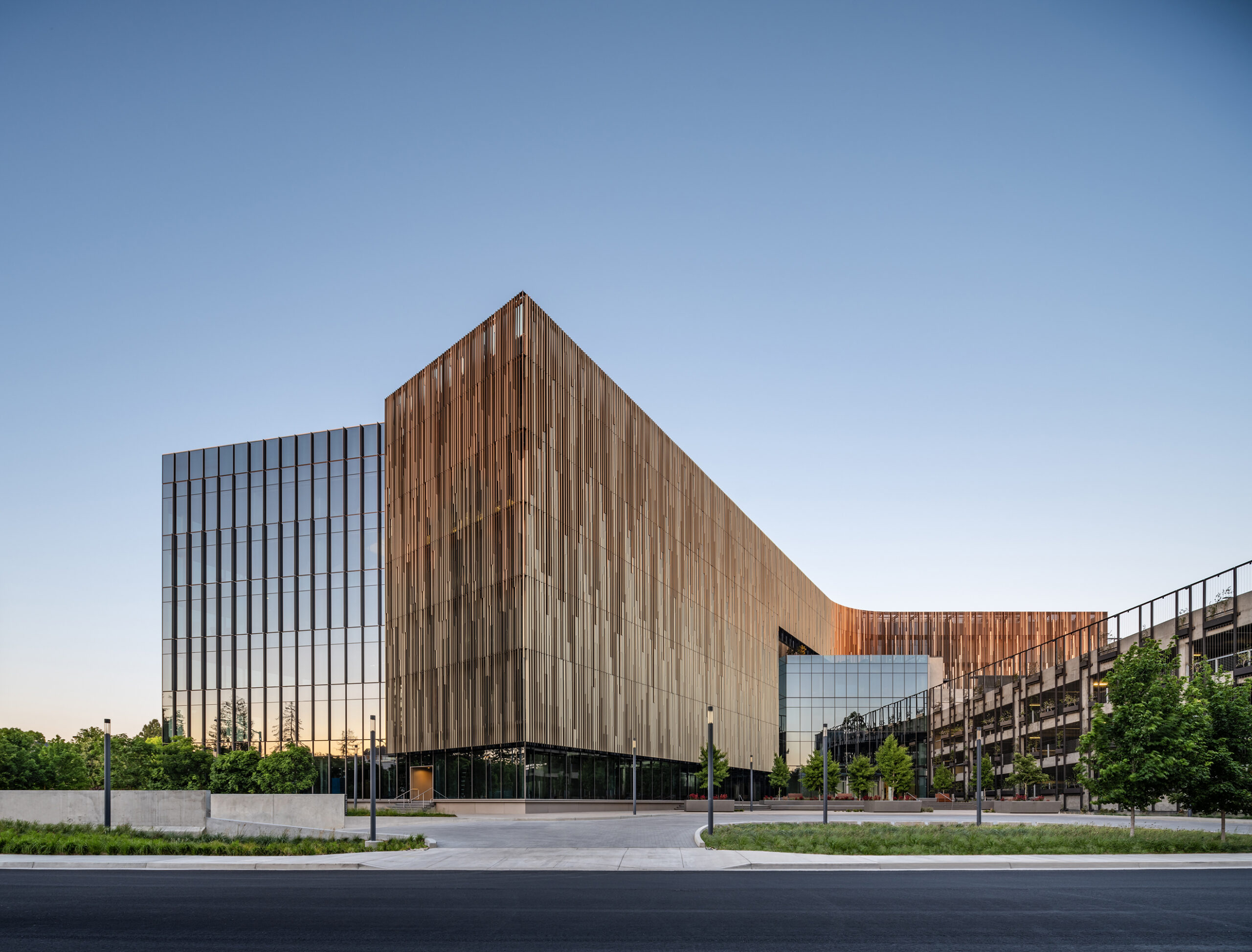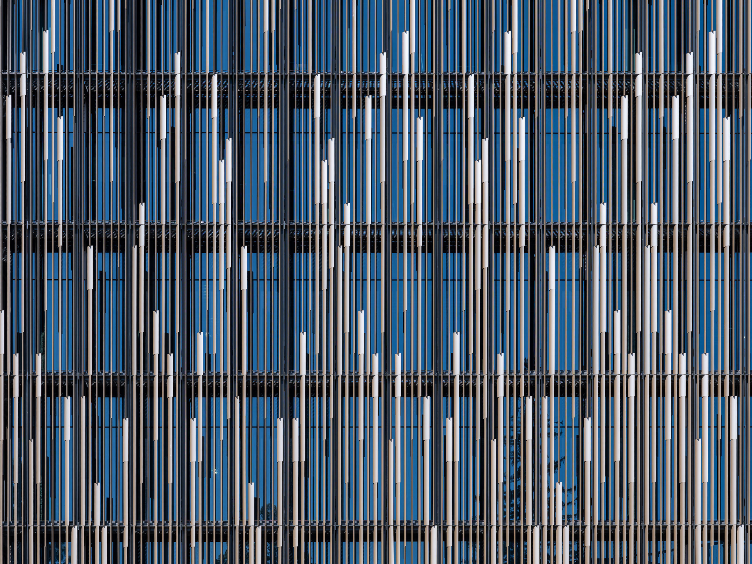 As you approach, that reading shifts. The seemingly solid volume is, in fact, wrapped in a continuous layer of vertical aluminum louvers set in front of a curtain wall. What first feels opaque begins to reveal depth and spacing. The fins are precisely angled to meet solar shading targets, turning the façade into a performative screen that contrasts with the unfiltered transparency of the glass corner.