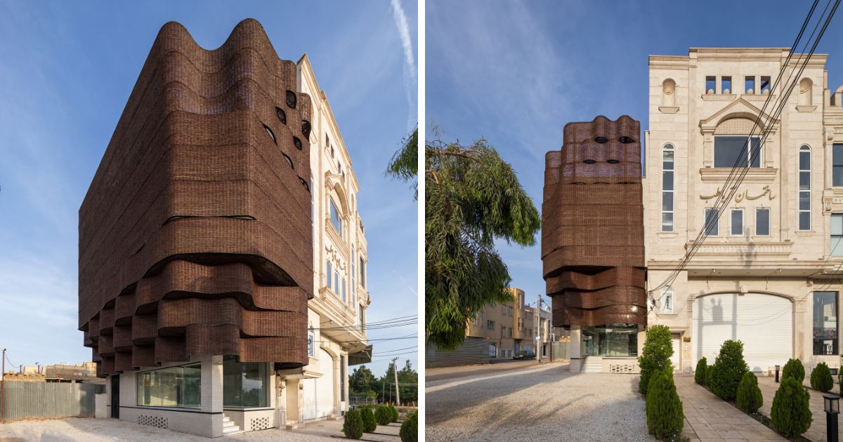 The woven screen stands before a conventional structural frame, creating a clear separation between load-bearing construction and climatic envelope. Its porous surface filters Yazd’s intense sun and moderates heat, acting as a breathable membrane rather than a sealed wall. The contrast lies in the meeting of scales and values: fragile branches assembled by hand set against urban mass and standard building methods, transforming low-cost organic material into a permanent civic façade.